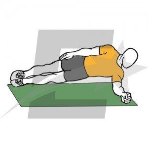 Colocaos en la posición que muestra la foto, apoyando el antebrazo y el pie. El codo debe quedar directamente debajo del hombro, y la cadera no debe dejarse caer. Aguantad la posición durante 30-60 segundos.
