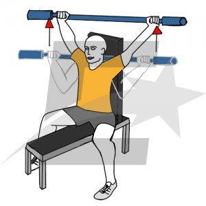 De pie o sentado, tomando un agarre un poco más abierto que la anchura de los hombros, con la barra detrás de la cabeza y apoyada entre el cuello y la parte superior de la espalda, se toma aire y se eleva sobre la cabeza estirando los brazos expulsando el aire.