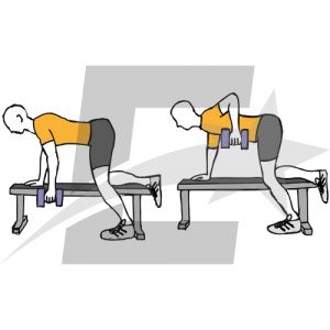 Tomando una mancuerna con una mano, flexionar el tronco y apoyar la mano libre sobre un banco. La rodilla opuesta a la que trabaja podemos apoyarla sobre el banco. Sin mover la espalda, elevar la mancuerna hasta la cintura expulsando el aire.