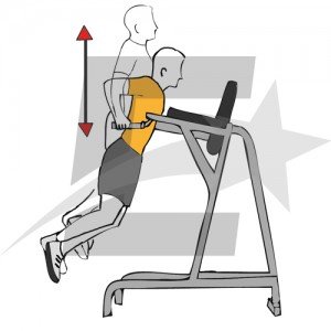 Este ejercicio nos permite modificar las zonas de incidencia que normalmente se trabajan en el press en banco plano. En este caso se incidirá en las porciones inferiores del pectoral mayor. También intervienen los tríceps.